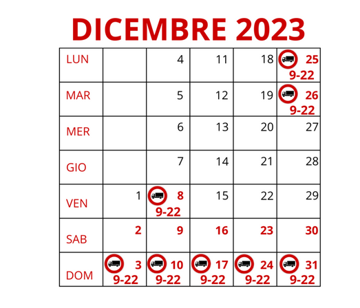 Per il periodo natalizio la circolazione dei mezzi pesanti (massa complessiva maggiore 7,5 TON) è vietata sempre dalle 09.00 alle 22.00 dei giorni 09, 24, 25, 26 e 31 dicembre.
