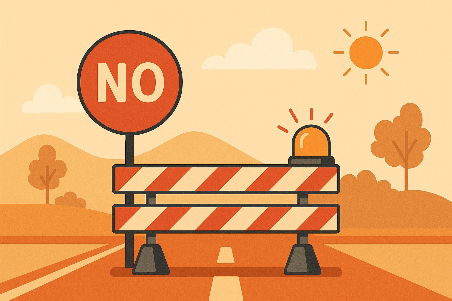 Illustrazione stilizzata con colori caldi che raffigura un blocco della circolazione su una strada soleggiata, con transenne e cartelli di divieto.